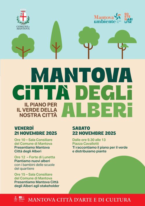 Altro appuntamento importante, realizzato in collaborazione con Mantova Ambiente del Gruppo Tea, sarà sabato 22 novembre presso un gazebo allestito in piazza Cavallotti, dove, oltre ad essere raccontato ed illustrato il Piano per il verde della nostra città, saranno distribuite gratuitamente, dalle 9.30 alle 13, delle piante alla cittadinanza e a tutti i presenti.