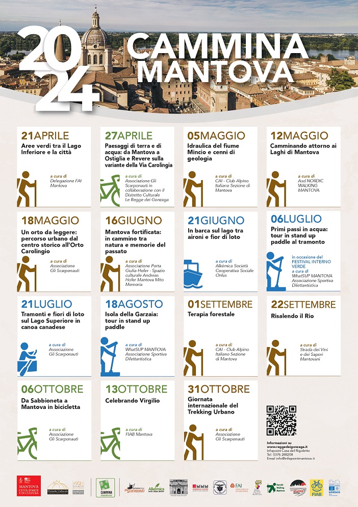 Il calendario propone 15 percorsi, il primo il 21 aprile a cura di Delegazione Fai Mantova dal titolo “Aree verdi tra il Lago Inferiore e la città”, l’ultimo il 31 ottobre in occasione della Giornata Internazionale del Trekking Urbano.