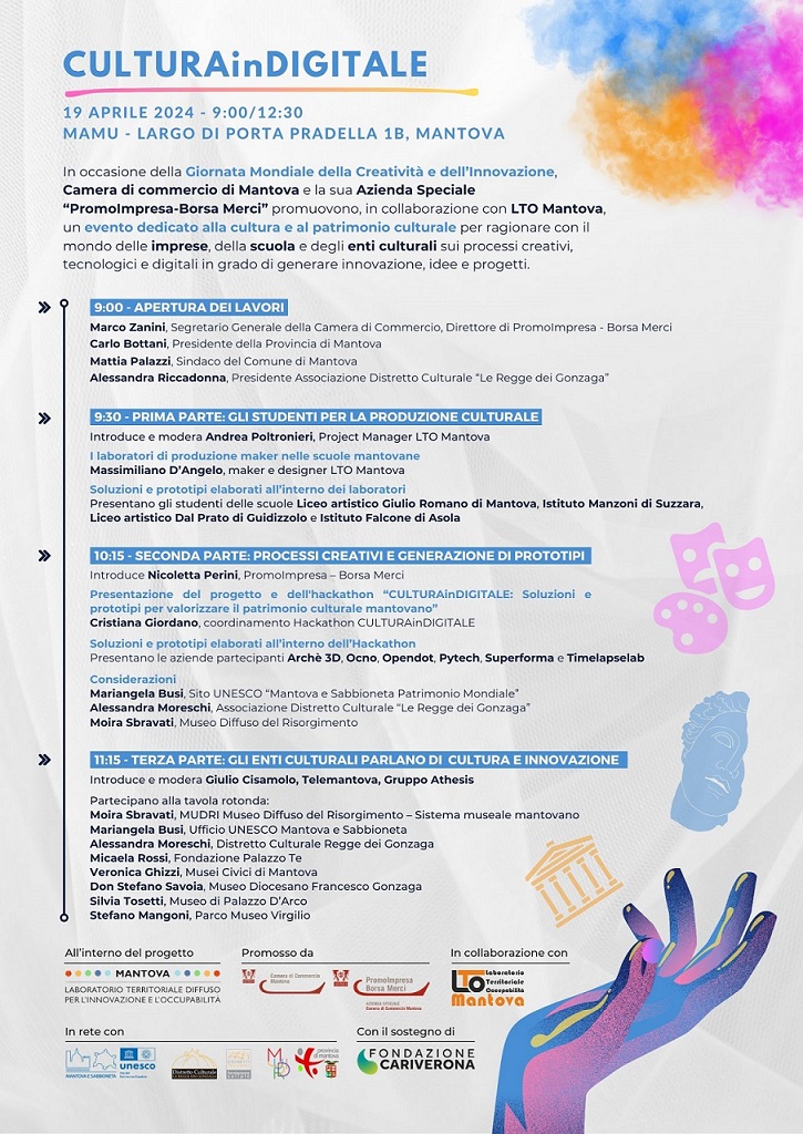 Venerdì 19 aprile, dalle 9 alle 12,30 presso il Centro congressi Mantova Multicentre, a Porta Pradella, si terrà il convegno “Culturaindigitale", in occasione della Giornata mondiale della creatività e dell’innovazione. E’ organizzato da Camera di commercio e PromoImpresa Borsa Merci in collaborazione con Lto.L’evento sarà aperto da Marco Zanini, segretario generale della Camera di commercio e direttore di PromoImpresa, Carlo Bottani, presidente della Provincia, il sindaco Mattia Palazzi e Alessandra Riccadonna, presidente dell’associazione distretto culturale Le Regge dei Gonzaga.