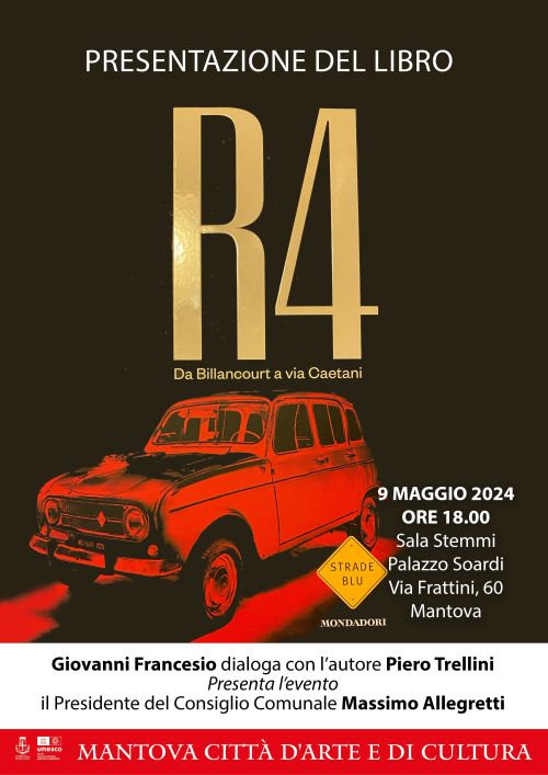 Il libro “R4 - Da Billancourt a via Caetani” del giornalista e scrittore Piero Trellini, edito da Mondadori, verrà presentato giovedì 9 maggio, alle 18, nella sala degli Stemmi di Palazzo Soardi, in via Frattini 60. L’autore, nel presentare il suo ultimo lavoro, dialogherà con Giovanni Francesio, direttore editoriale di Neri Pozza.