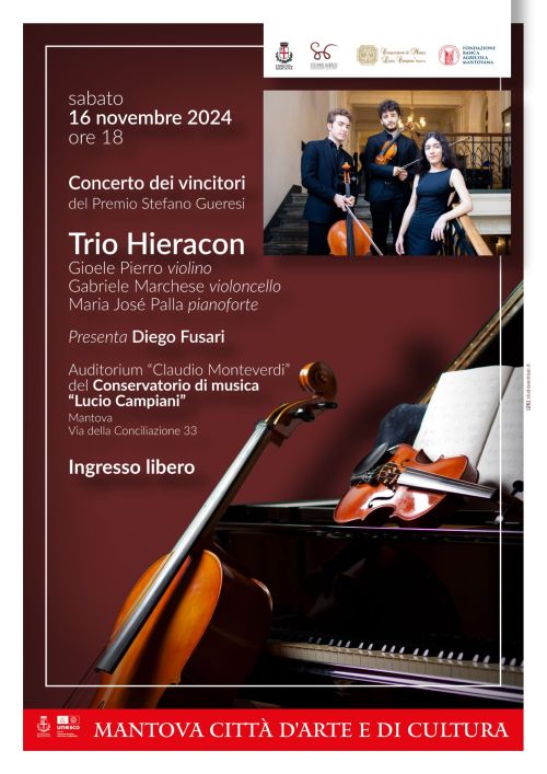 Si esibirà il trio Hieracon, una giovane formazione di grande talento che ha già ottenuto importanti riconoscimenti, costituita dalla pianista Maria José Palla, dal violinista Gioele Pierro e dal violoncellista Gabriele Marchese, lo scorso anno vincitore a Mantova anche del premio speciale in memoria del Maestro Massimo Repellini.