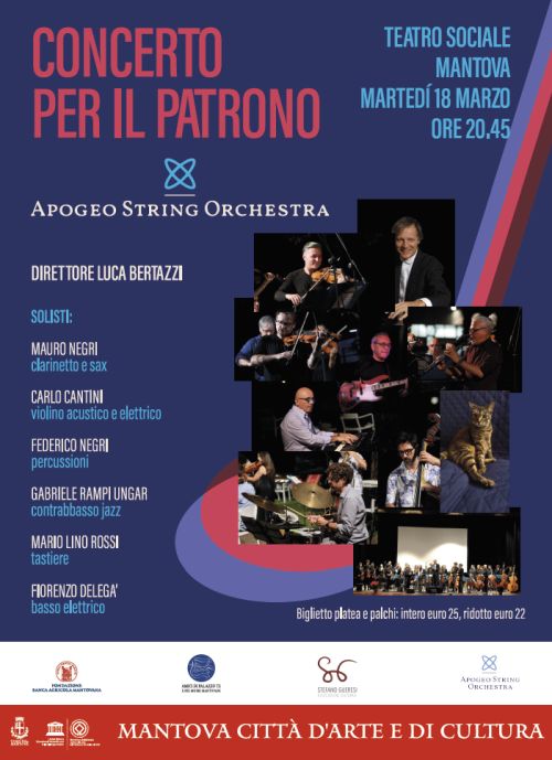 Un nuovo concerto della Apogeo String Orchestra, diretta da Luca Bertazzi, in calendario per il 18 marzo, alle 20.45, al Teatro Sociale di Mantova in concomitanza con la festività del patrono della città, Sant'Anselmo.