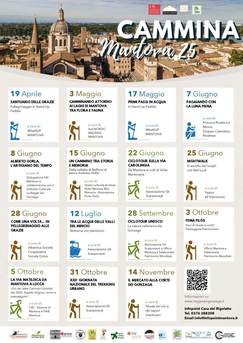 Il nuovo calendario propone 15 percorsi su tutto il territorio, a piedi, in bicicletta, in barca, in sup e anche in canoa, alla scoperta delle bellezze storico artistiche e naturali di Mantova e provincia. Il primo appuntamento si terrà sabato 19 aprile, a cura di WhatSup Mantova Associazione Sportiva Dilettantistica, con “Santuario delle Grazie, pellegrinaggio in stand up paddle”. L’ultimo, invece, sarà il 14 novembre, a cura di Associazione Strada dei vini e dei sapori mantovani Ets, dal titolo “Il mercato alla corte dei Gonzaga”. In mezzo tanti itinerari, specialmente lungo sentieri, ciclabili e fiumi, immersi tra la natura ed il contesto urbano.