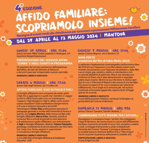 Il Comune di Mantova, Assessorato alle politiche e servizi per la famiglia e la genitorialità e il Servizio Affidi ‘Zorba’ si fanno promotori e sostenitori di un ricco programma di iniziative di sensibilizzazione in occasione della Giornata dell’Affidamento Familiare.