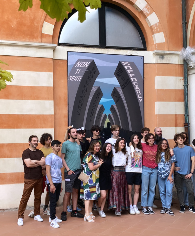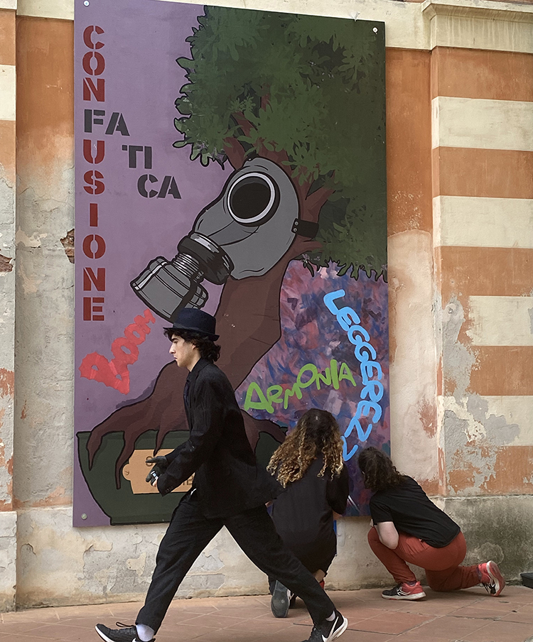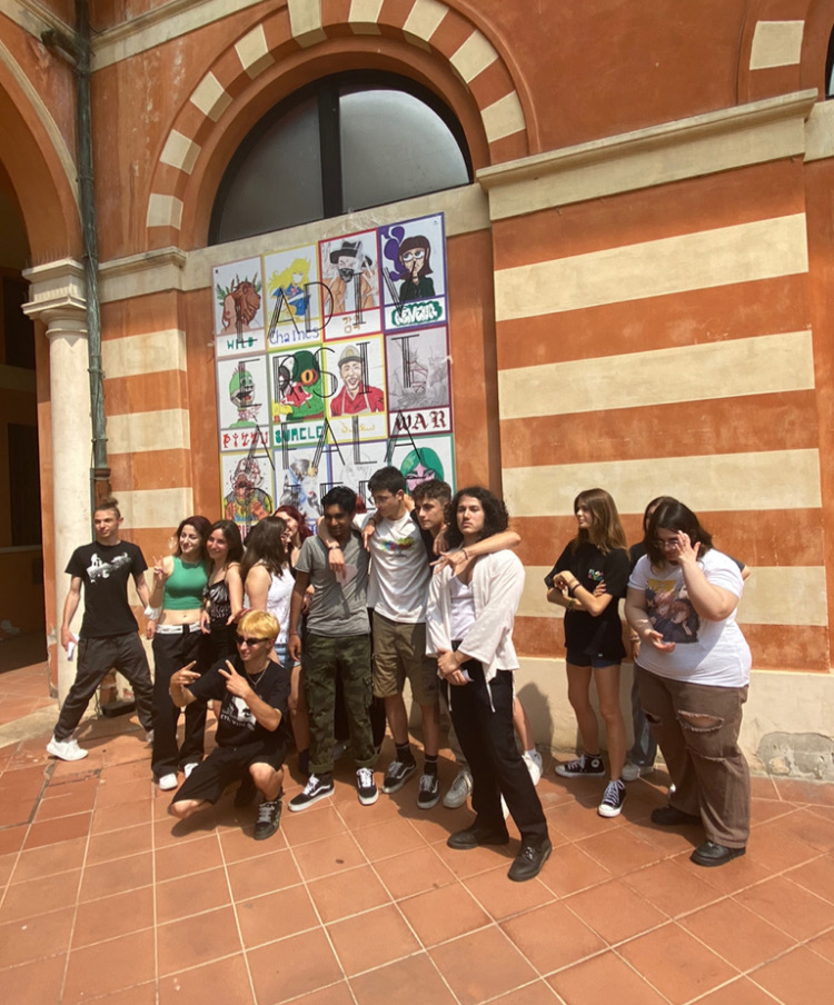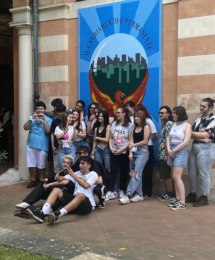 28 maggio 2022 Grande festa nel cortile del Baratta, trasformata in luogo di performance d’arte con protagonisti oltre 80 studenti del licei Giulio Romano e Belfiore, artistico e scientifico. Ai quattro lati del cortile c’erano altrettante opere d’arte realizzate con diverse tecniche su pannelli di 3 metri e 20 per 2, dove i ragazzi hanno rappresentato il loro “Sign of the Times”, un segno dei tempi correnti o appena attraversati, vissuti ora come libertà, nel tempo e nello spazio, reale e immaginario
