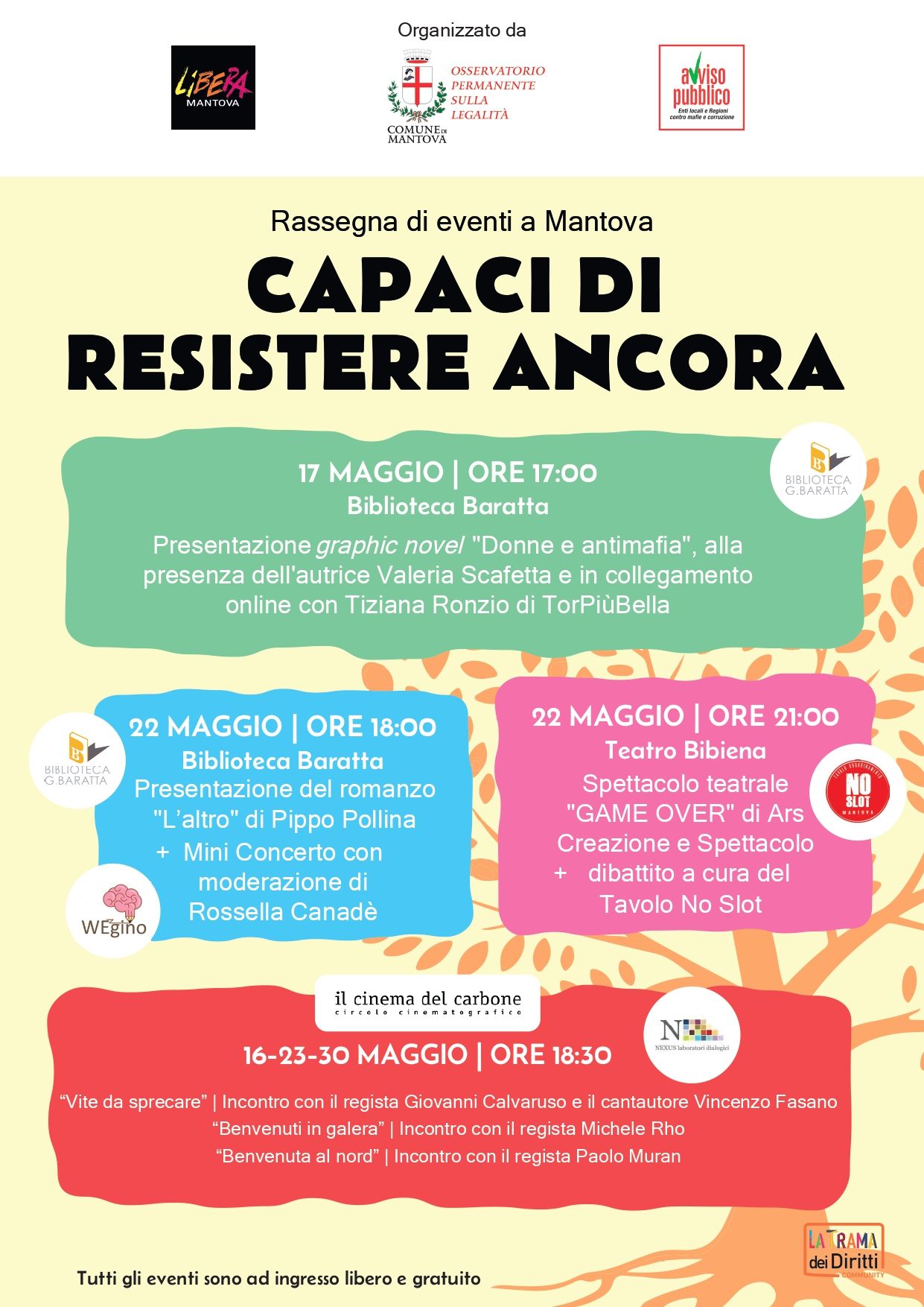 La rassegna "Capaci di Resistere Ancora", fin dalla sua prima edizione, si propone di coinvolgere attivamente gli enti e le associazioni del territorio che si dedicano alle tematiche legate alla legalità. Anche quest'anno, il programma è stato concepito per attrarre un pubblico diversificato attraverso iniziative interessanti e stimolanti. Queste offriranno al pubblico l'opportunità di approfondire temi cruciali legati alla legalità, quali il gioco d'azzardo patologico e l'azione delle donne contro la mafia, utilizzando metodologie artistiche come il teatro, la musica, il cinema e naturalmente, la parola.