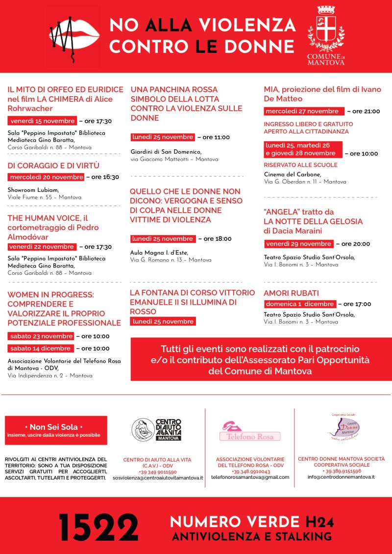 Di seguito il programma completo delle iniziative promosse dall’assessorato Politiche e Servizi per la Famiglia e genitorialità e Pari opportunità del Comune di Mantova in occasione della Giornata Internazionale per l’Eliminazione della Violenza sulle Donne