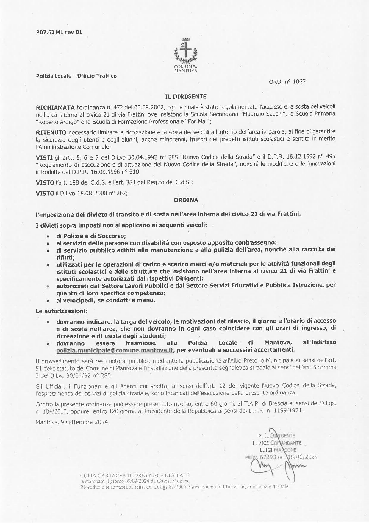 Sono vietati l’accesso e la sosta dei veicoli nell’area interna via Frattini 21 in città dove hanno sede la scuola secondaria “Maurizio Sacchi”, la scuola primaria “Roberto Ardigò” e la scuola di formazione professionale For. Ma. Lo stabilisce un’ordinanza della Polizia Locale del Comune di Mantova firmata lunedì 9 settembre a pochi giorni dall’apertura del nuovo anno scolastico.