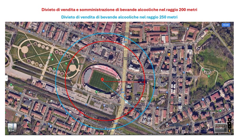 • Il divieto, oltre che della vendita, anche della somministrazione di bevande con contenuto alcolico superiore al 5% del volume all’interno dello stadio Martelli ed all’esterno dello stesso nel raggio di 200 metri (come da allegata planimetria);