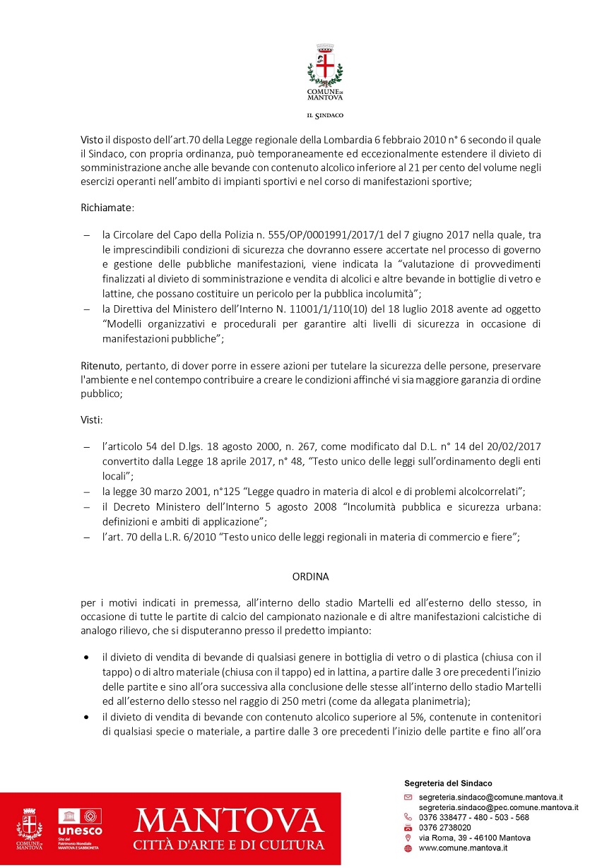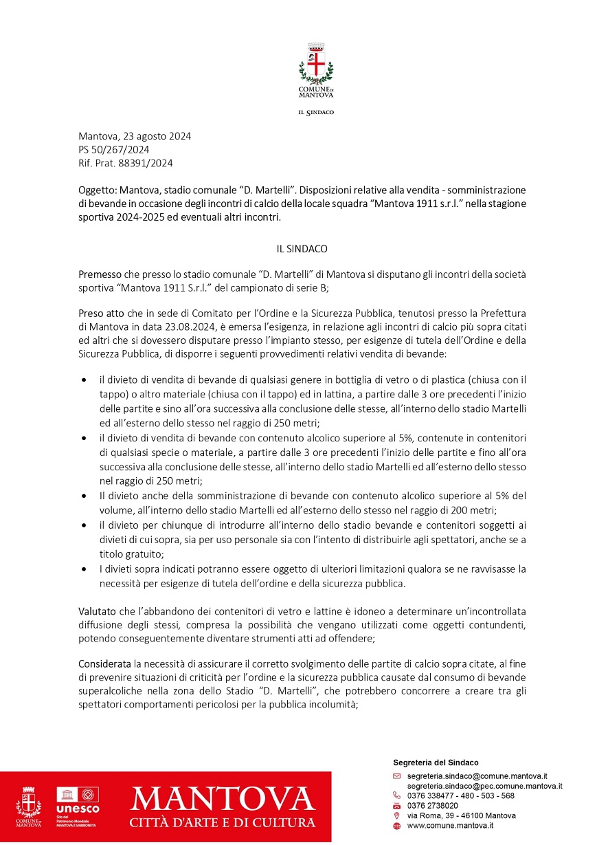 Il sindaco di Mantova Mattia Palazzi venerdì 23 agosto ha firmato un’ordinanza che stabilisce le disposizioni relative alla vendita e alla somministrazione delle bevande in occasione degli incontri di calcio della locale squadra “Mantova 1911 srl” allo stadio Martelli nella stagione sportiva 2024-2025 ed eventuali altri incontri.