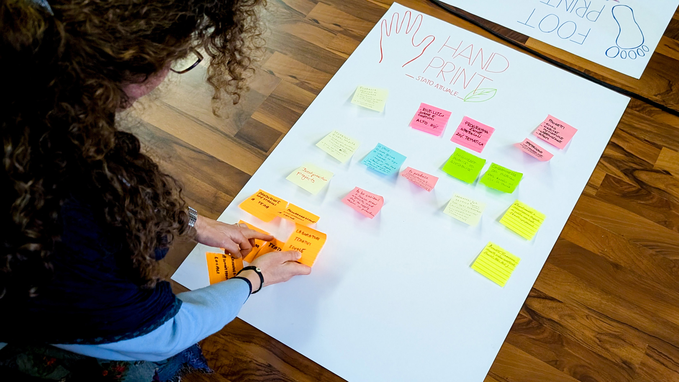 - Il primo workshop ha invitato i partecipanti a esplorare due concetti fondamentali della sostenibilità: Footprint e Handprint. Due grandi fogli posti sul pavimento, uno per ciascun concetto, sono stati riempiti con post-it colorati su cui i partecipanti hanno condiviso riflessioni, esperienze e idee legate al proprio contesto professionale. Il confronto che ne è nato ha arricchito la comprensione collettiva dei punti di forza e delle criticità del presente.