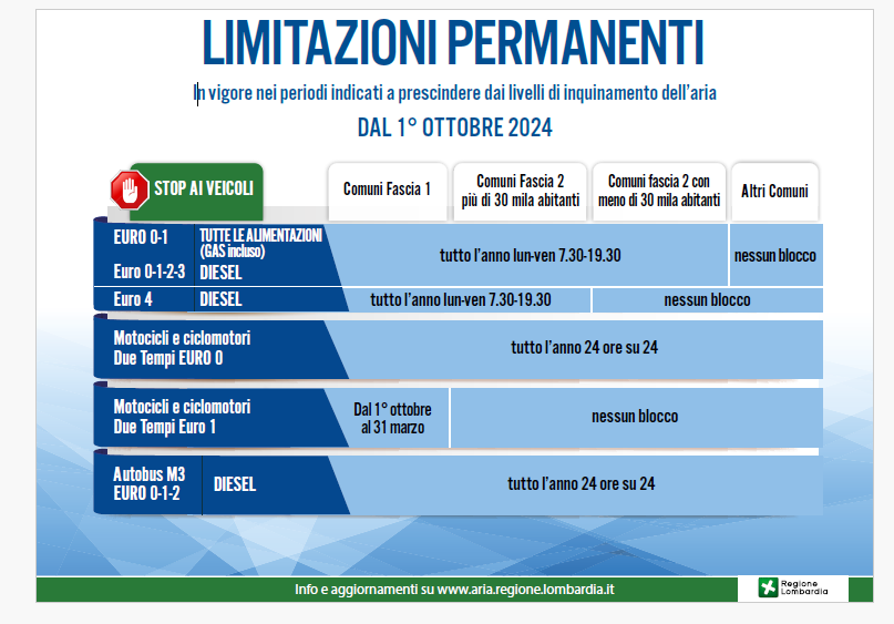 Per ulteriori informazioni: https://www.regione.lombardia.it/wps/portal/istituzionale/HP/DettaglioRedazionale/servizi-e-informazioni/cittadini/Tutela-ambientale/Qualita-dell-aria/misure-di-limitazione-per-qualita-aria/misure-di-limitazione-per-qualita-aria