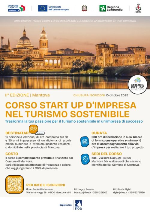 Dopo il successo della prima edizione, sono aperte le iscrizioni alla seconda edizione del corso “Start up d’impresa nel turismo sostenibile” nell’ambito del progetto del Comune di Mantova “Generare il futuro, dalla scuola alla città”.